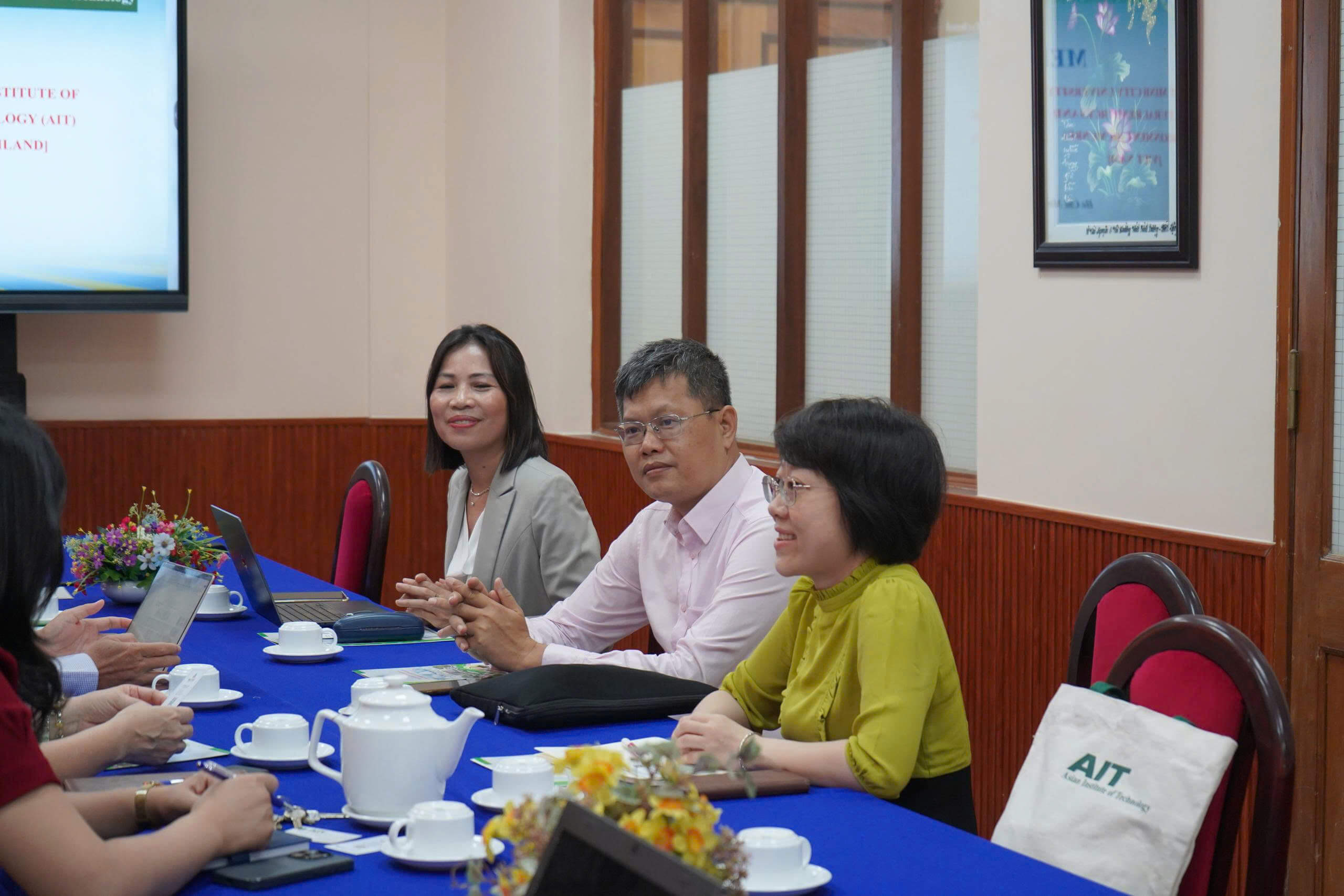 Về phía đối tác, tham dự buổi làm việc gồm có Bà Nguyễn Thị Phước Lai – Trưởng khoa Khoa Chính sách công và Phát triển bền vững; Ông Lê Thanh Quyền – Chủ tịch Hiệp hội Cựu sinh viên AIT tại Việt Nam; và Bà Nguyễn Hoàng Mỹ Phương – Nghiên cứu sinh tại AIT.
